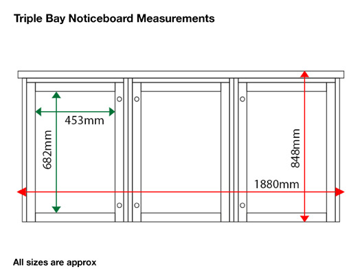 | Triple bay dimensions | Overall dimensions - 848mm high x 1880mm wide (excluding optional header) Visible display area - 3 x bays each 682mm (h) x 453mm (w) - Ideal for 12 x A4 portrait posters |